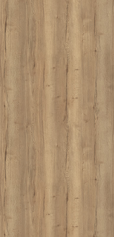 Description: Natural Halifax Oak is popular decor for us in kitchens or living room furniture, as its striking cracks and knots, create the look of nature and authenticity in the living space. It works very well in combinations with modern materials, such as metal, glass, and stone. Thanks to the XL repeat, meaning reduced repetition of cracks in the decor image, it can also be used on large surfaces and is enhanced by the synchronised texture ST37 Feelwood Rift.